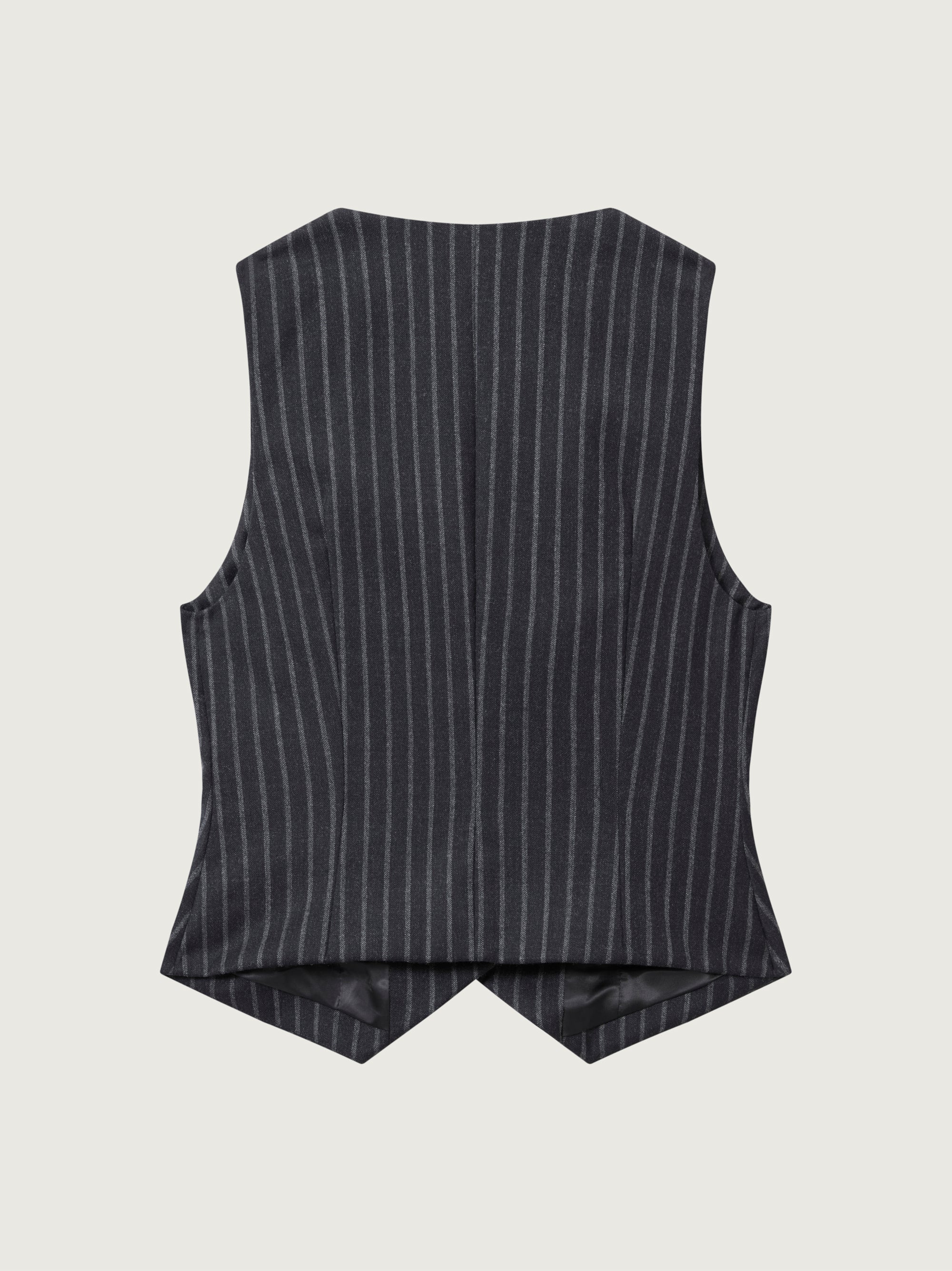 The Chalkstripe Wool Vest refines suiting tradition with a fitted waist and deep V neckline. Cut from navy and grey chalkstripe wool, it fastens with tonal buttons and finishes with a curved hem. Designed to pair with the tailored pants or worn on its own for sharp contrast.