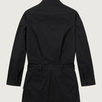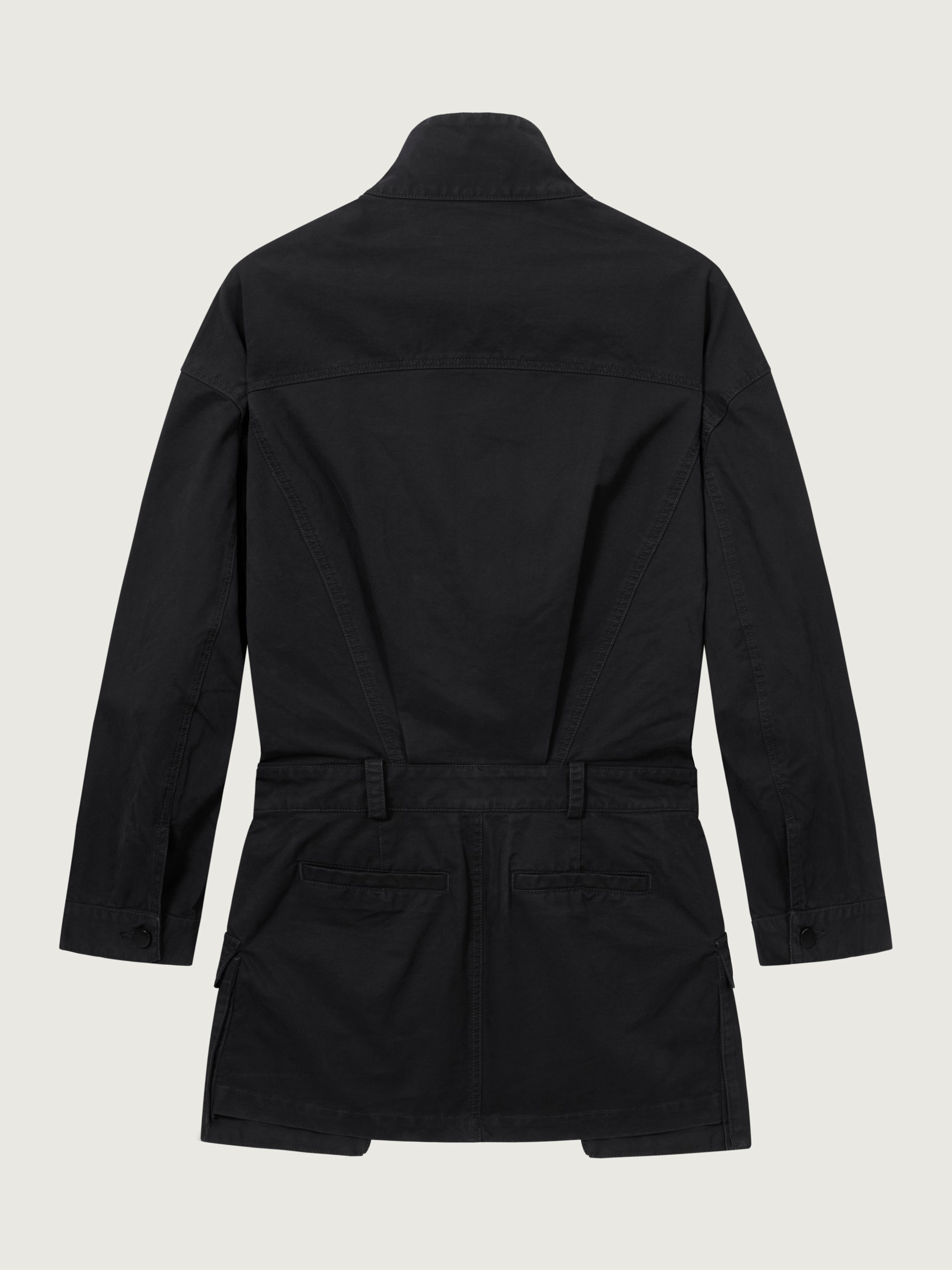 Cut from sturdy cotton drill, the Gunther Cargo Mini Dress balances utilitarian detailing with sculptural form. It features a high funnel neckline, front flap pockets, and a belted waist that shapes the oversized silhouette into a structured mini length.
