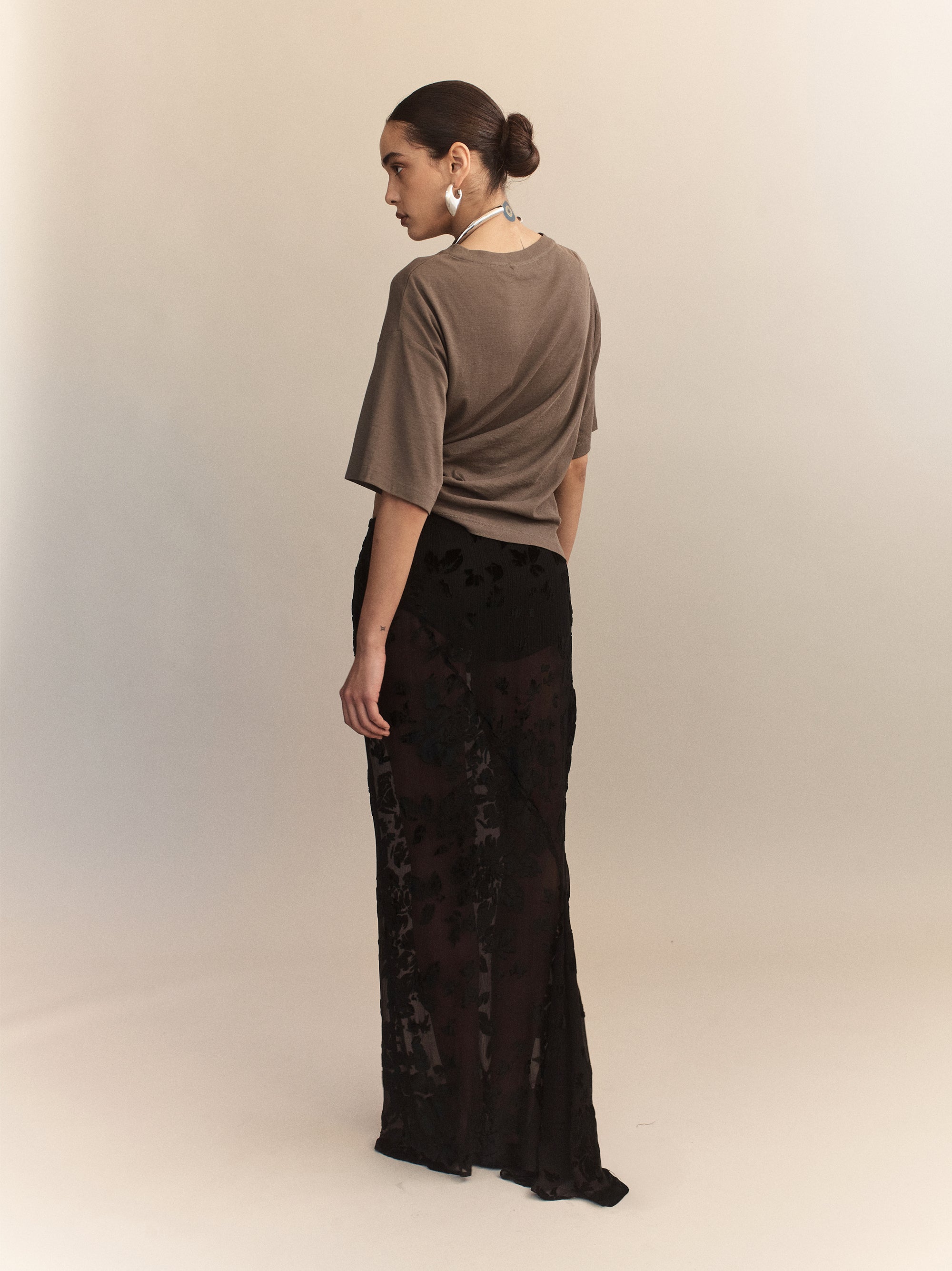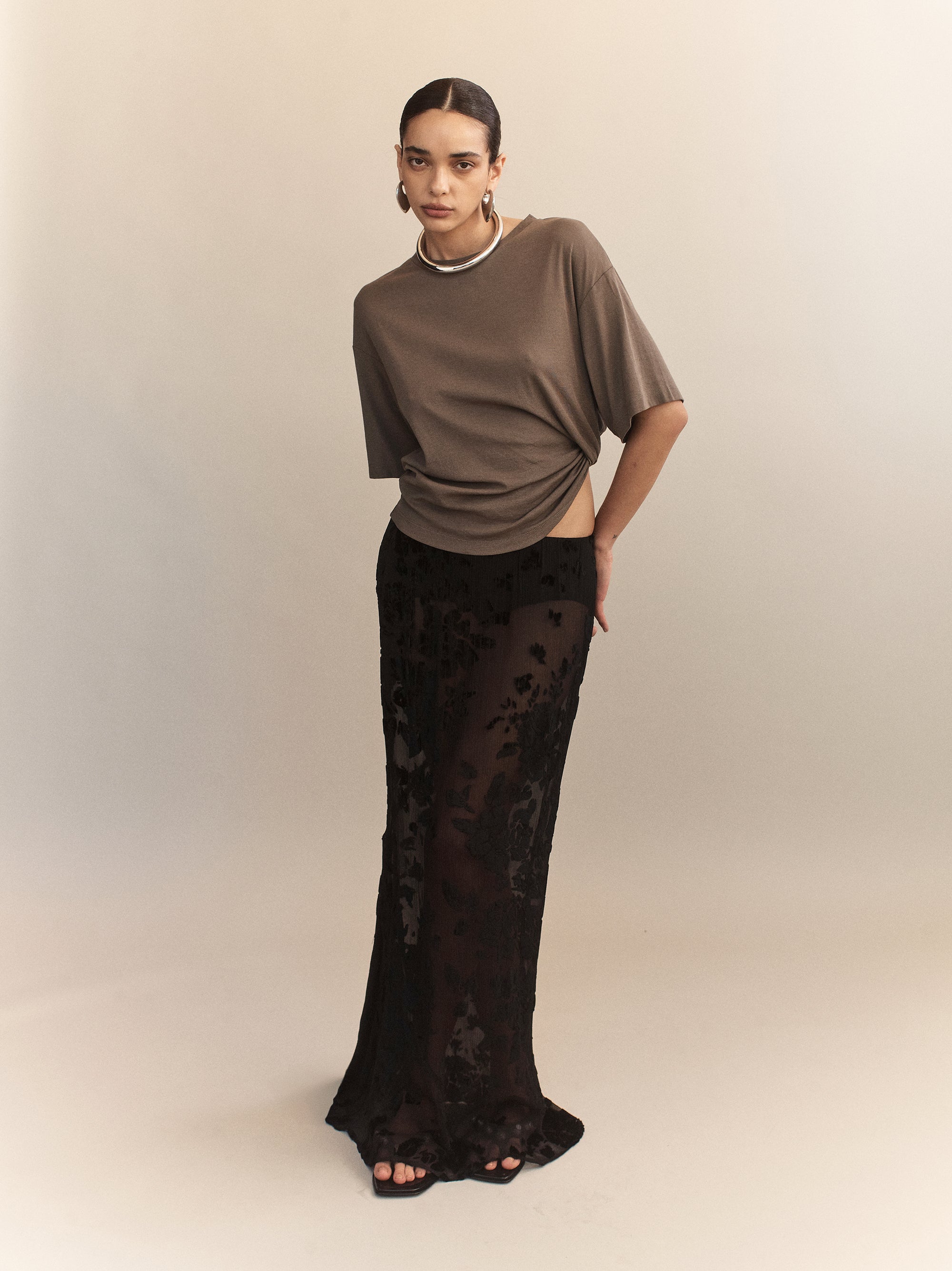 Cut from silk velvet devoré, the Eirene Silk Velvet Devore Skirt features a sheer base with a tonal velvet floral motif. Designed to sit close through the hips before falling into a soft flare, it moves fluidly with the body. A built-in jersey brief provides coverage while maintaining the lightweight, semi-sheer finish.