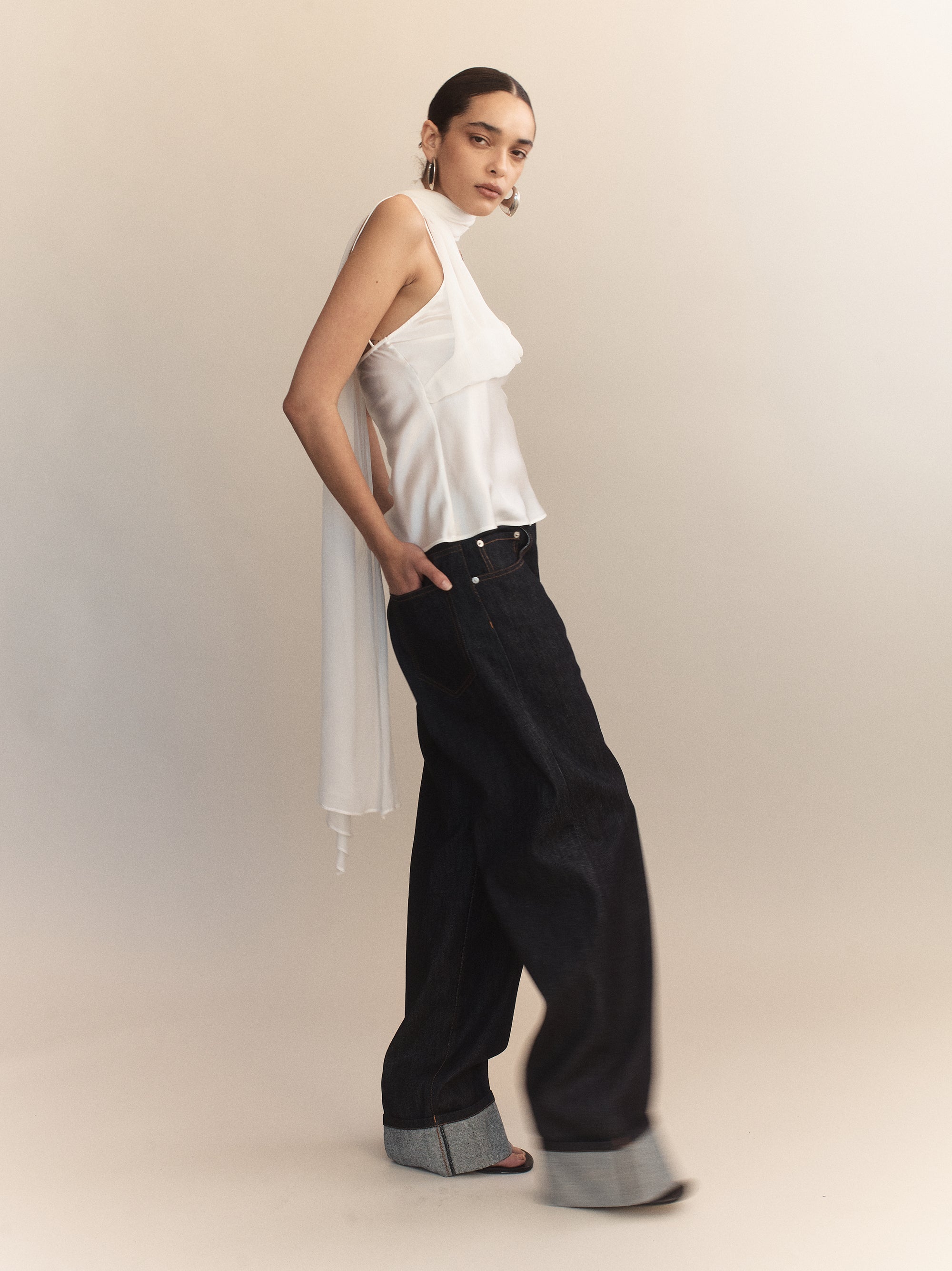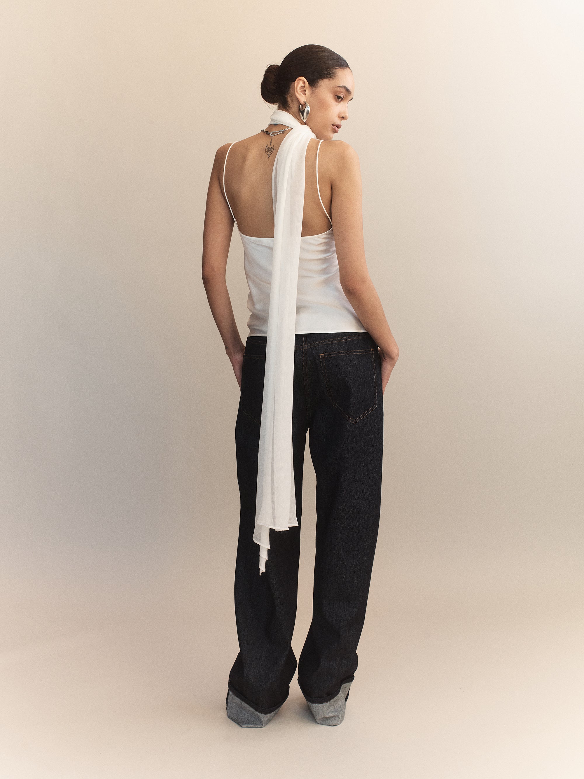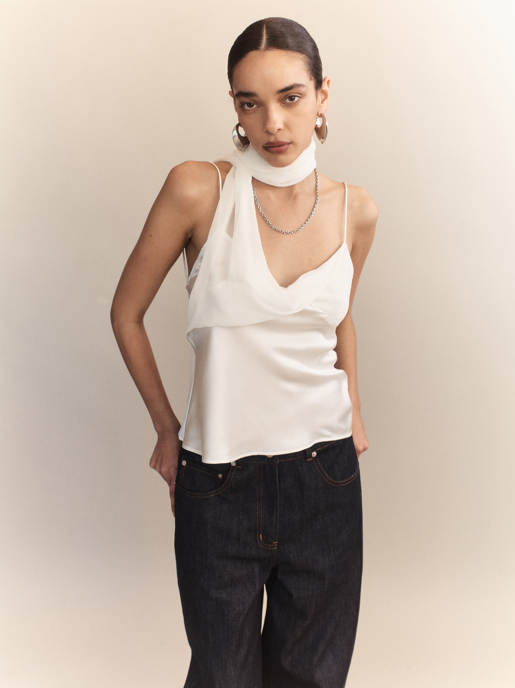 Constructed from lightweight silk-viscose blend, the Elia Silk Scarf Camisole features a fluid scarf panel integrated into the neckline, designed to wrap or trail down the back for added drama. Characterised by a delicate bias cut and subtle luminosity, this piece is a minimalist essential designed for intentional layering or independent wear.