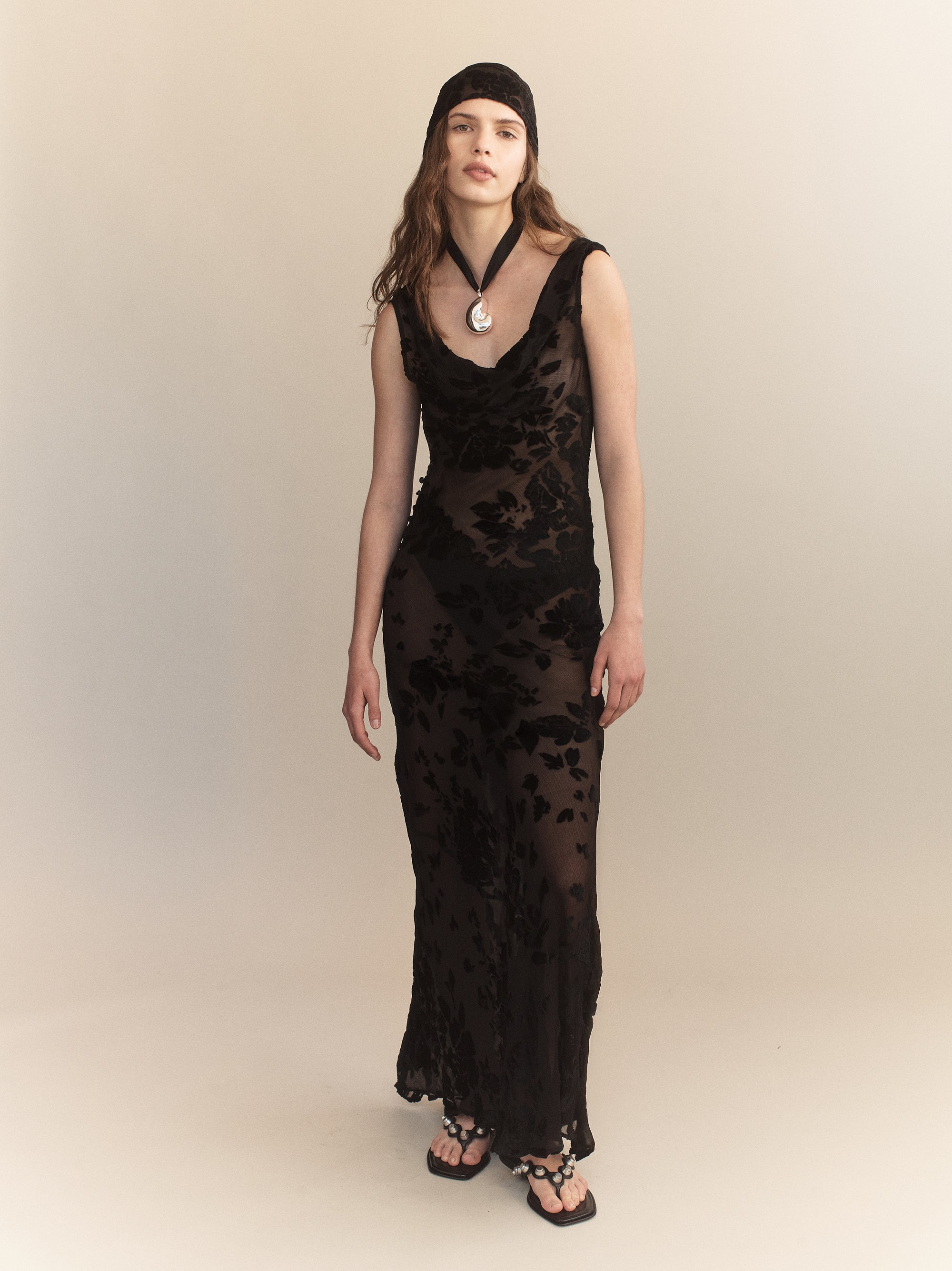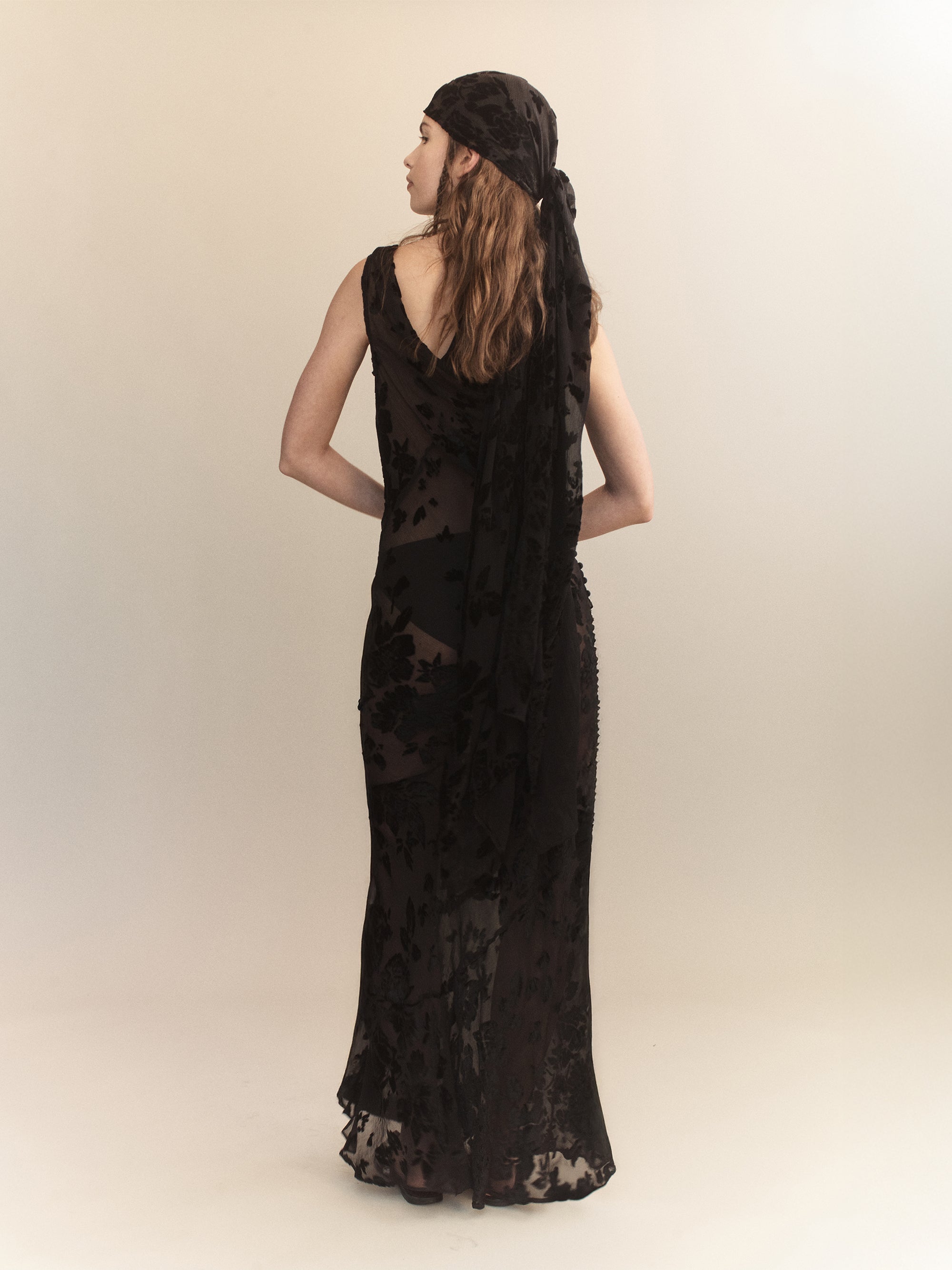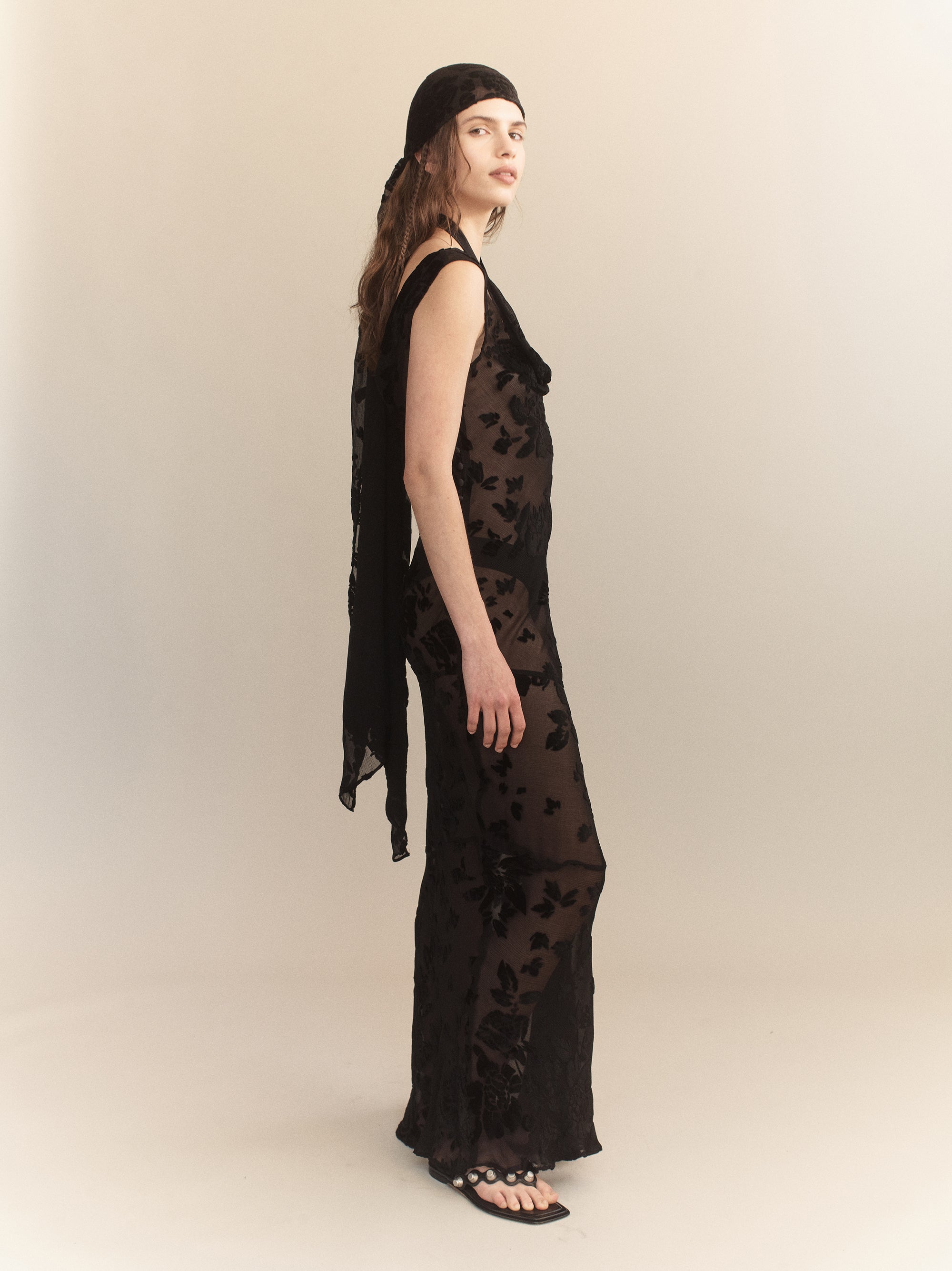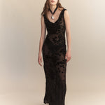 The Eugenie Silk Velvet Devore Dress is cut from sheer silk-blend devore, patterned with tonal velvet florals. Designed to follow the body, it features a soft V neckline and a sleeveless silhouette. The semi-transparent finish highlights the texture of the burnout technique, while the full-length cut maintains a streamlined line.