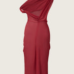 The Lorens Dress is crafted in pure silk, draped to fall asymmetrically off one shoulder. A gathered knot at the hip creates fluid folds that contour the body, while the back dips into a soft open line. Designed with a mid-length hem, it balances sensuality with sculptural restraint.