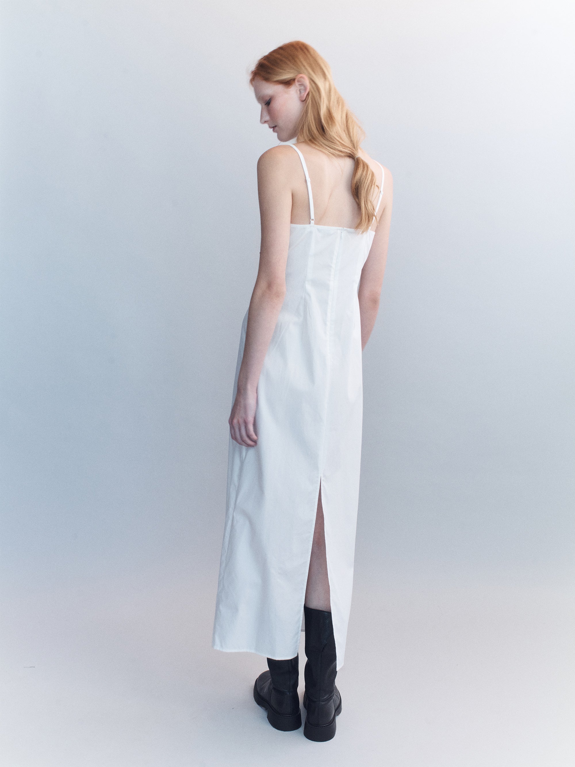 The Odette Dress is cut from crisp cotton poplin, designed with a structured bodice shaped by bullet bra seaming. Fine straps frame the shoulders, while the column skirt falls to a midi length with a back vent for movement. Its precise lines and minimal detailing refine a classic slip silhouette.