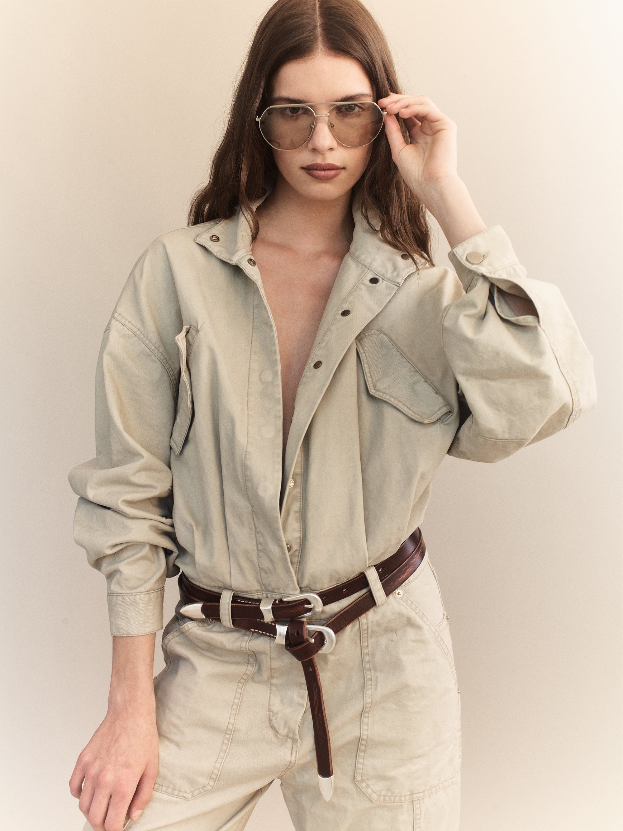 The Gunther Cotton Drill Cargo Jumpsuit merges utilitarian ease with a reimagined bomber silhouette. Crafted from garment-dyed cotton twill, it features exaggerated batwing sleeves, a voluminous blouson top, and wide cargo-style legs. Designed to be worn belted at the waist or loose.