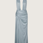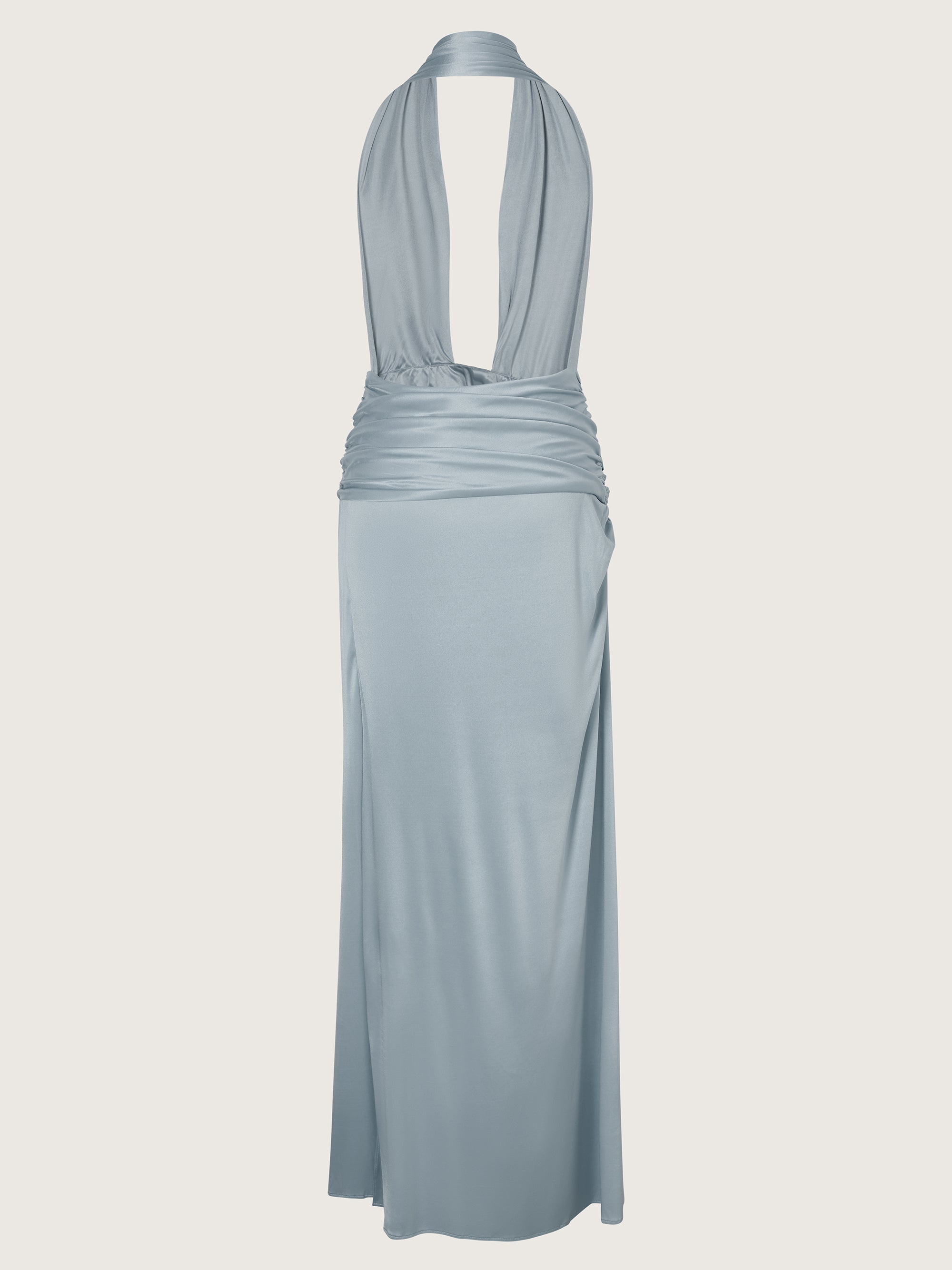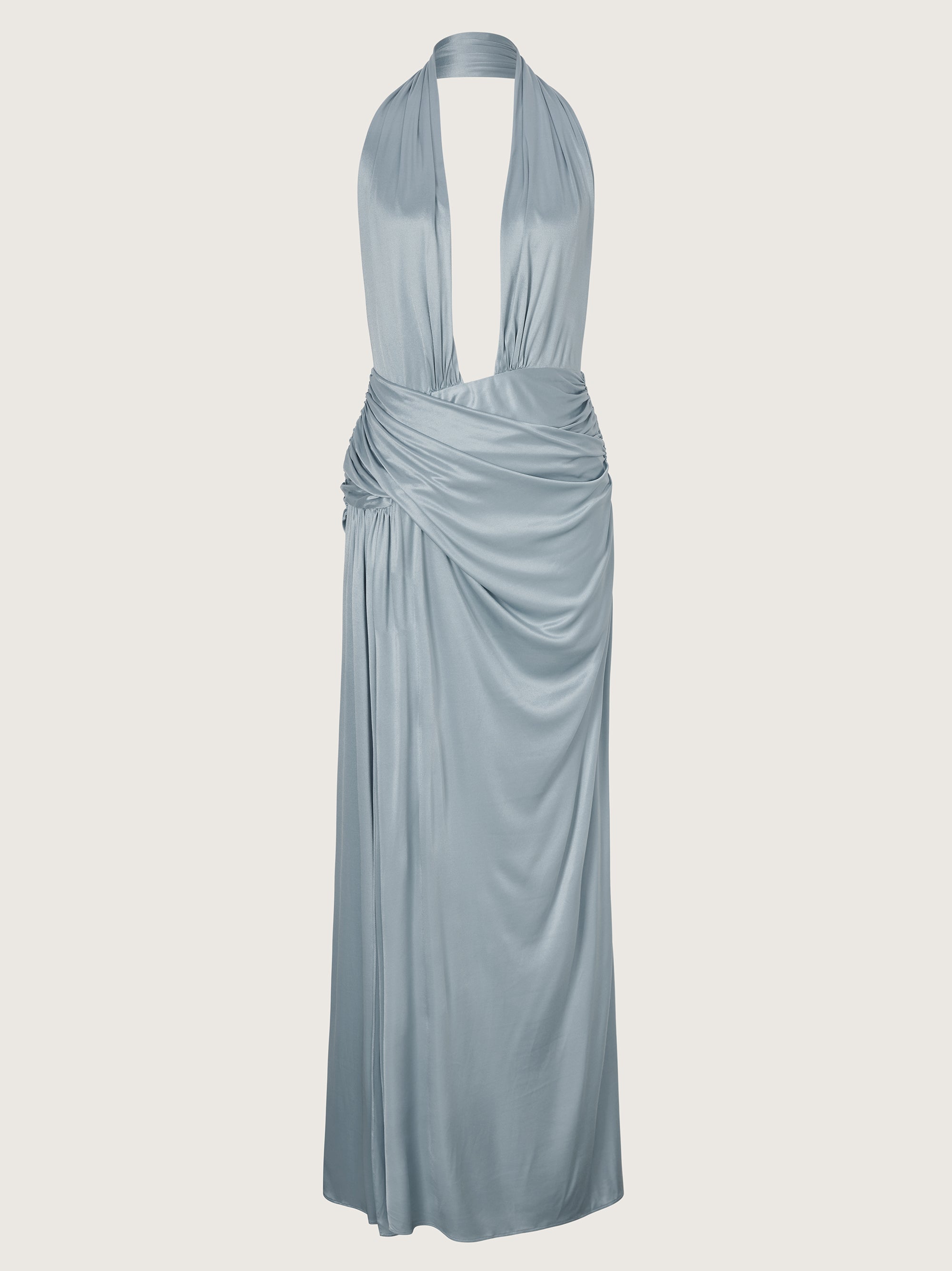 Cut in a cool-touch acetate jersey with a plunging neckline, ruched drapery across the body and dual splits at either front and back.