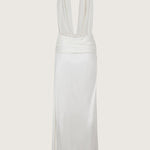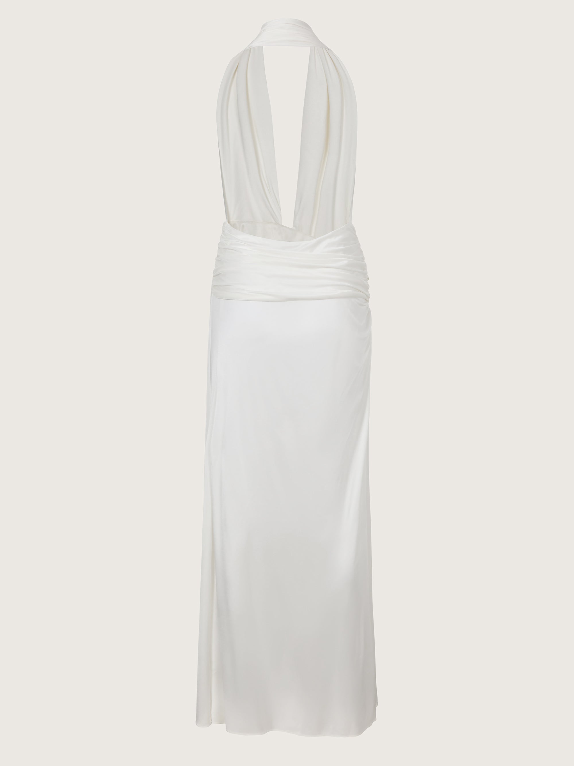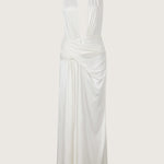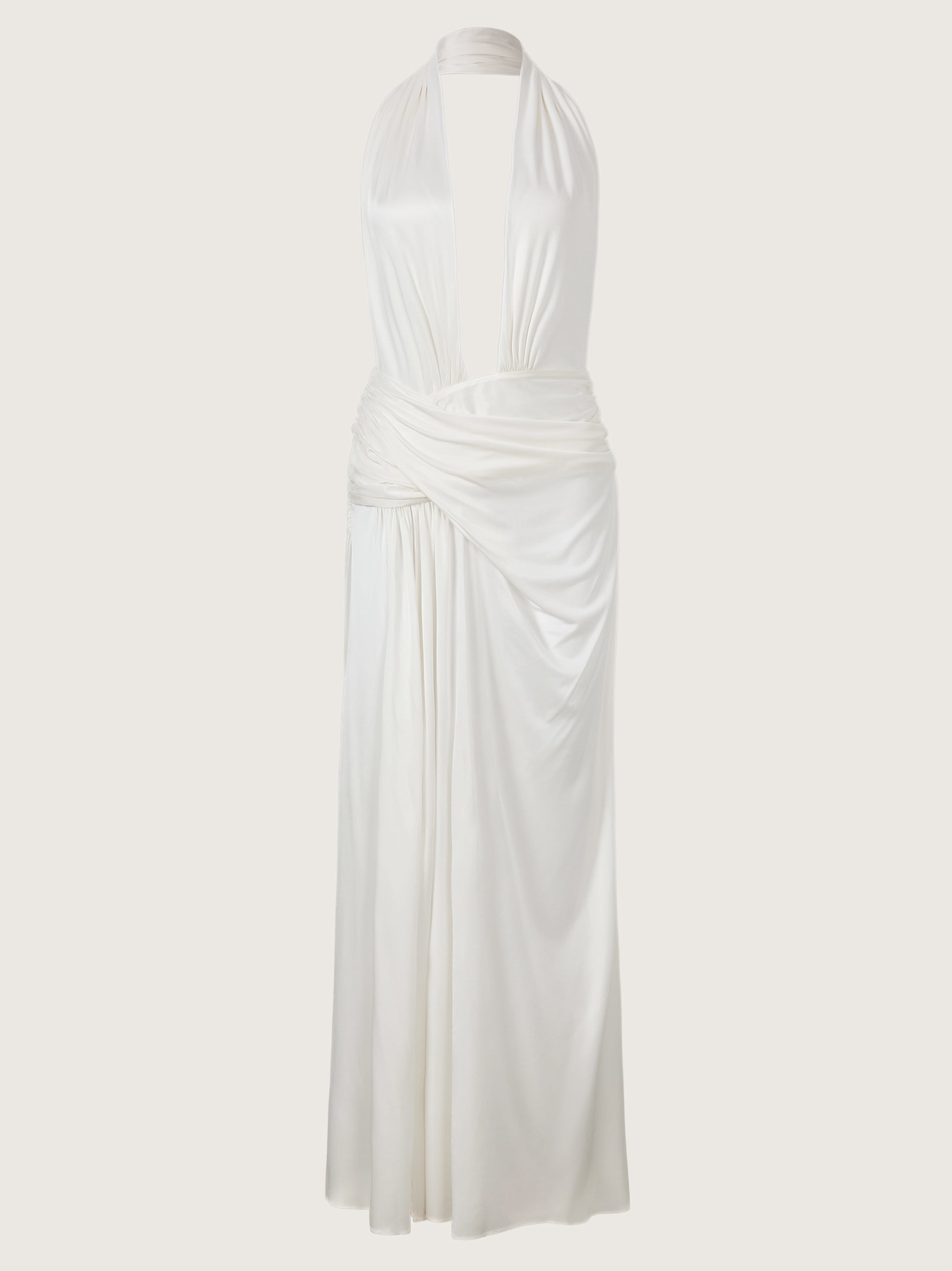 Cut in a cool-touch acetate jersey with a plunging neckline, ruched drapery across the body and dual splits at either front and back.
