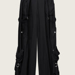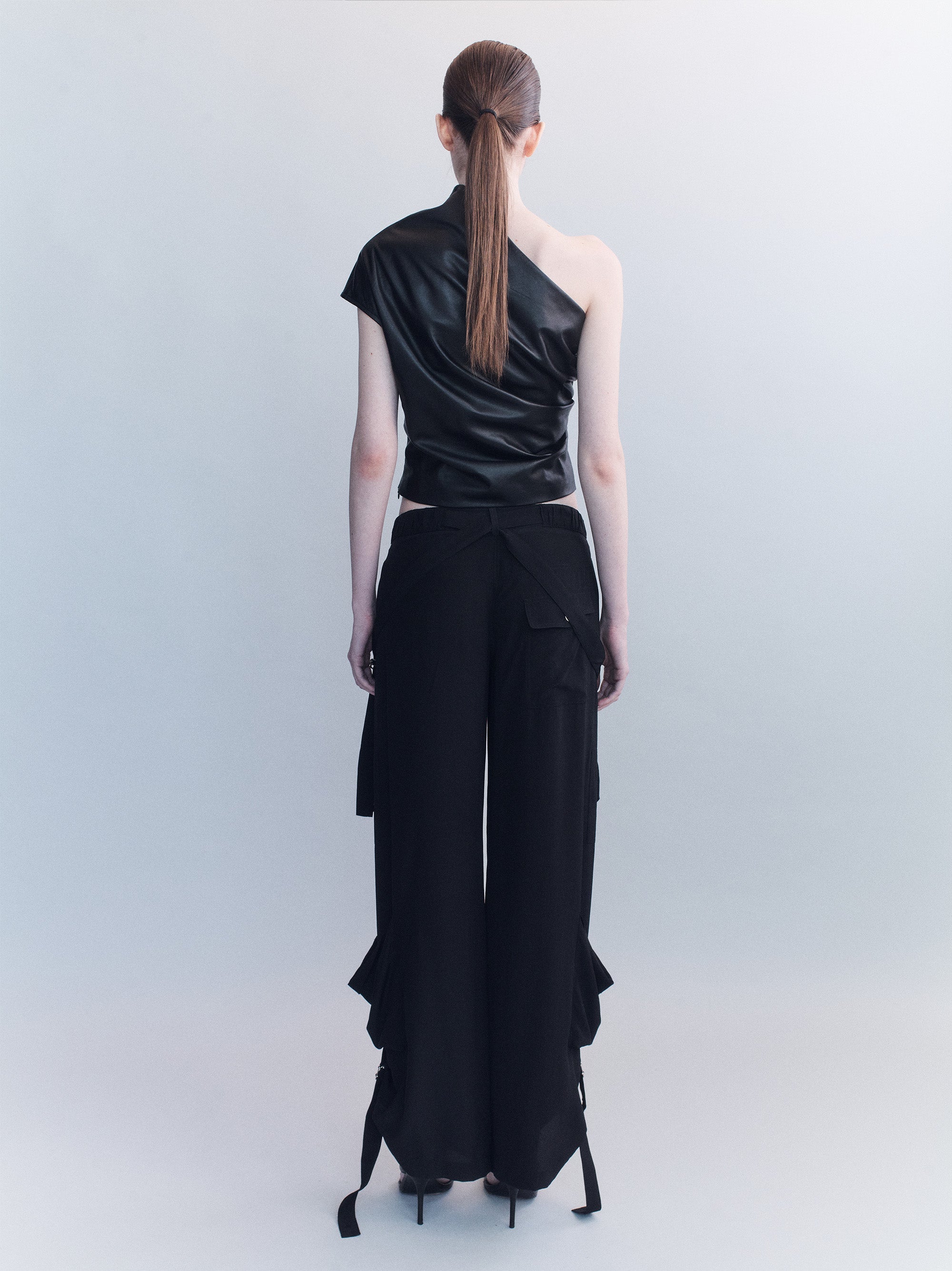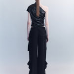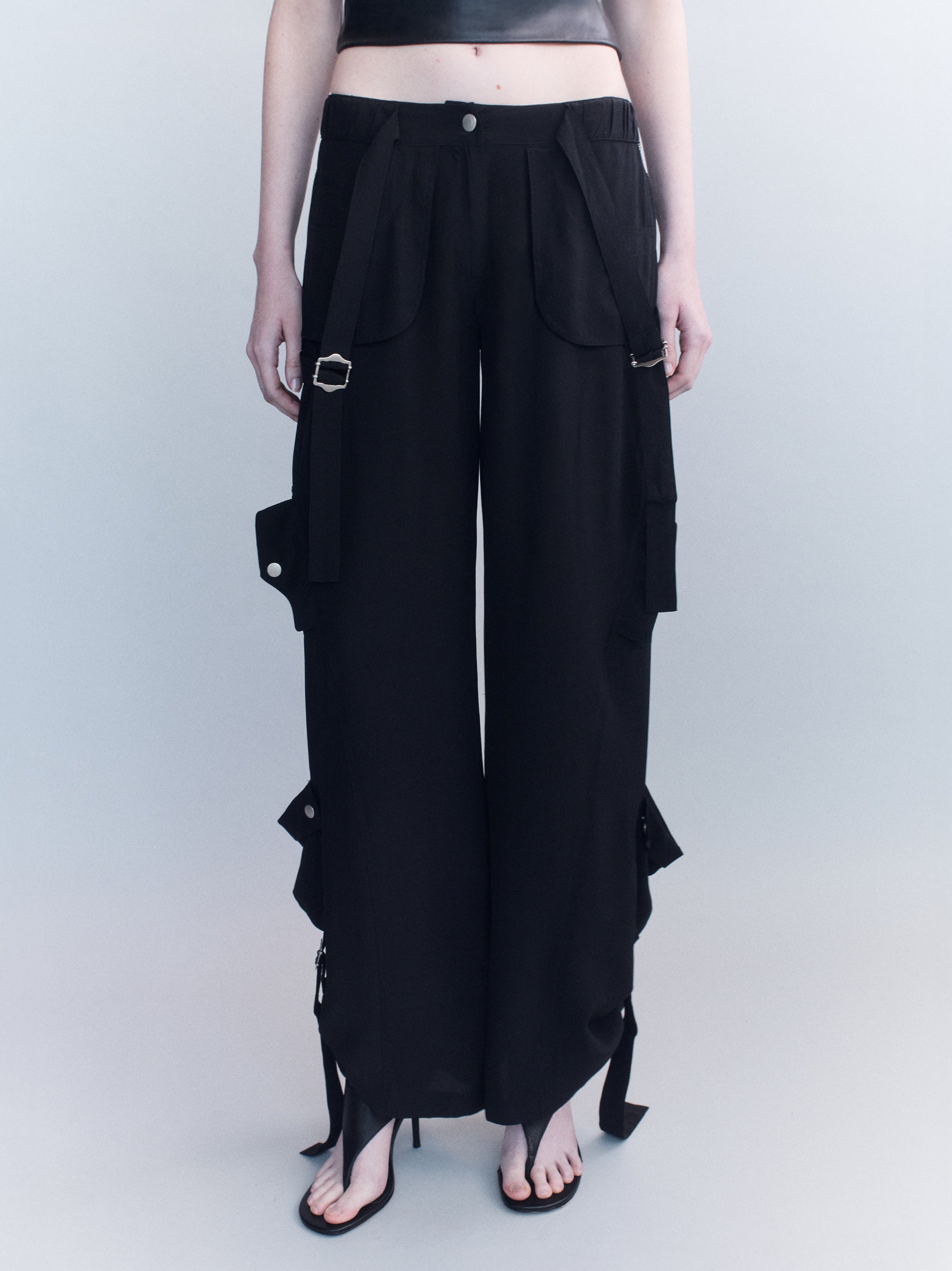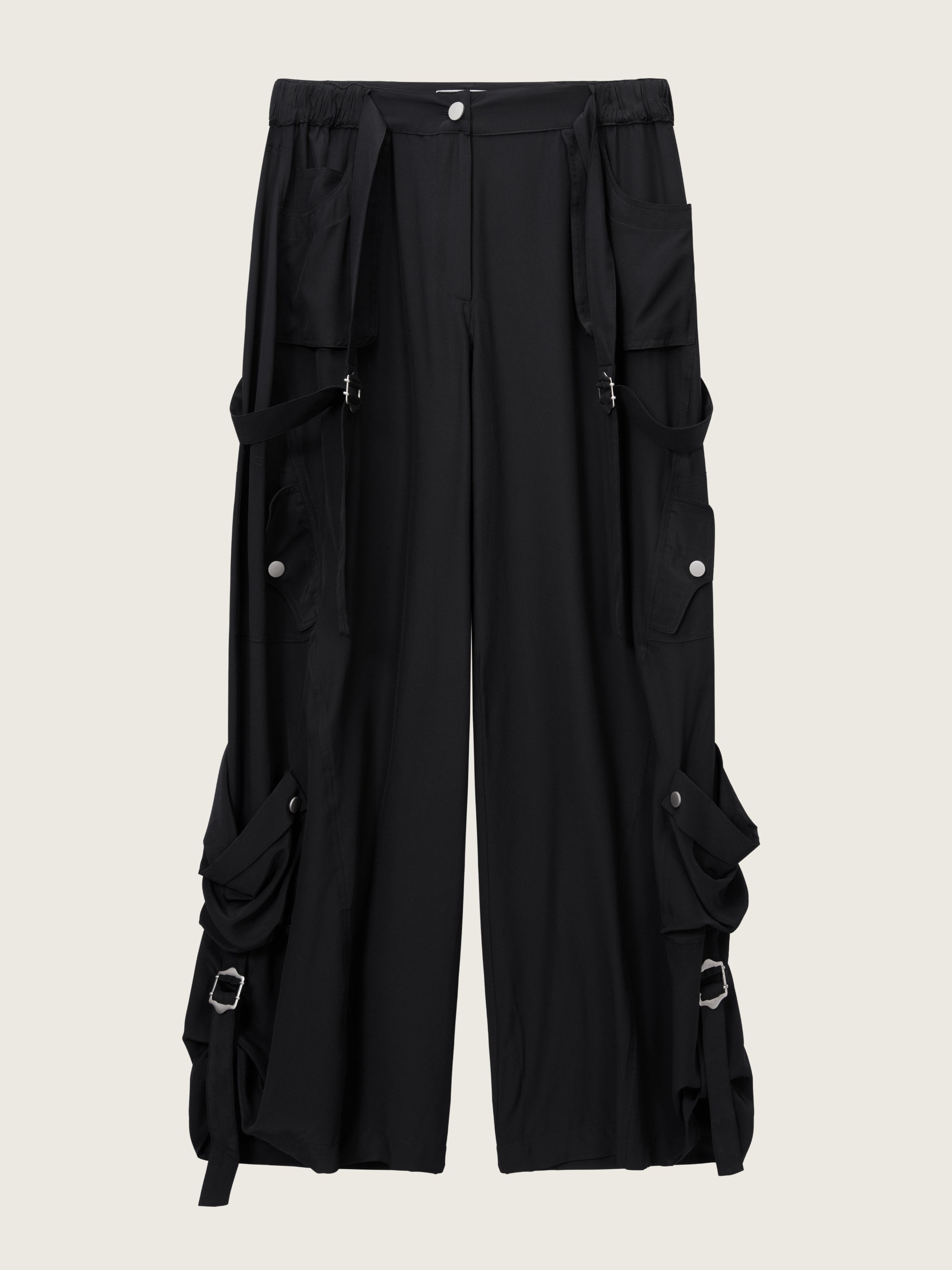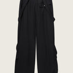 The Larson Pants reinterpret cargo codes in fluid silk crepe, balancing utilitarian detail with a draped, elongated line. Featuring oversized flap pockets, adjustable straps, and hardware trims, the wide leg falls with controlled ease while retaining a directional, urban edge.