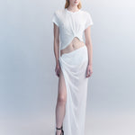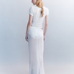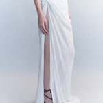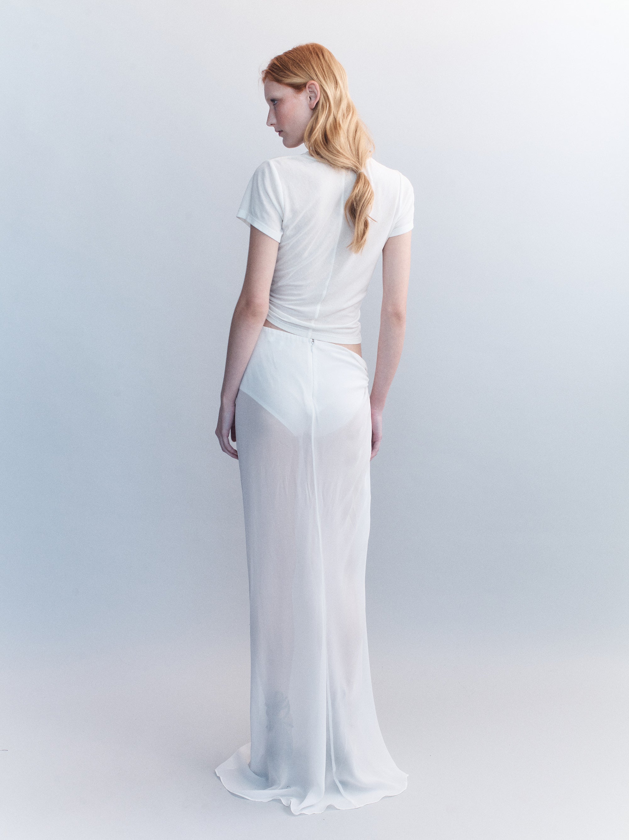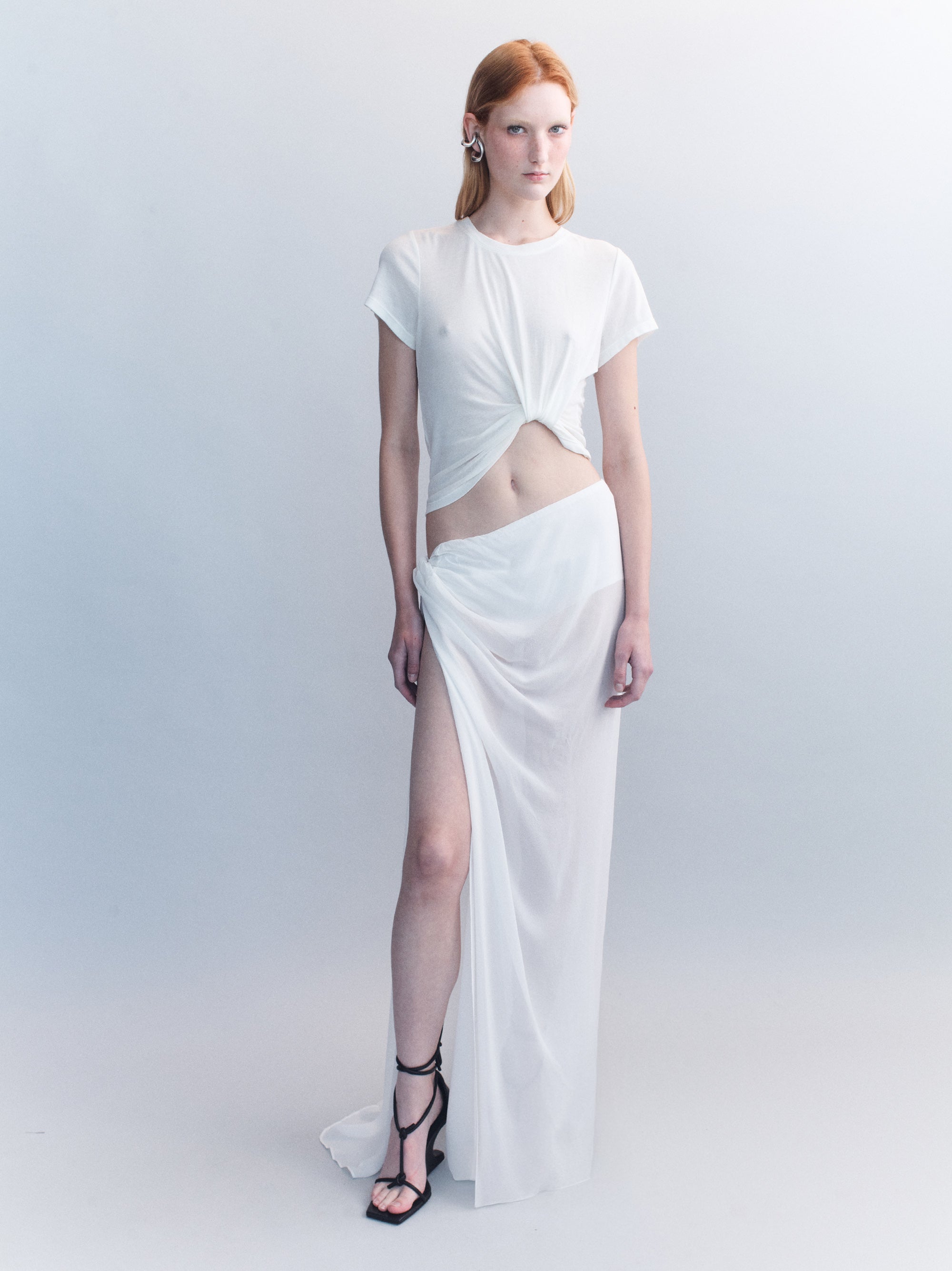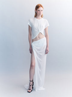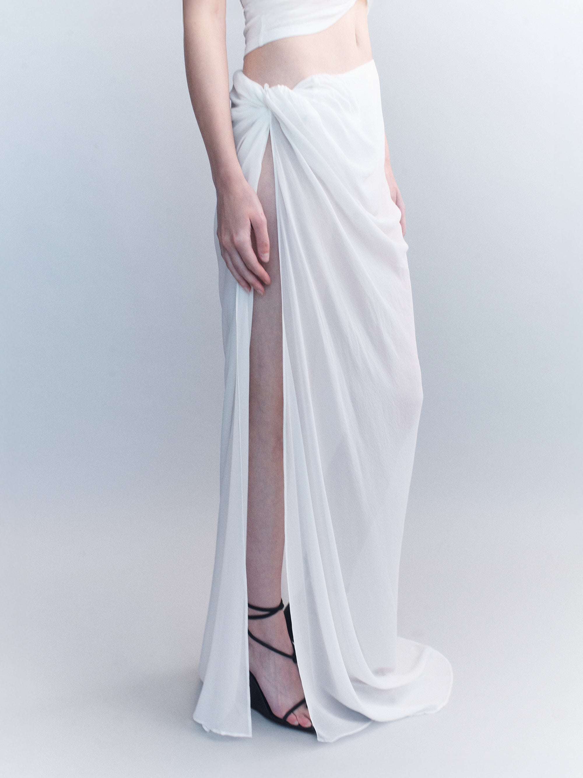 Sheer silk georgette is cut into a sarong-inspired silhouette, knotted at the hip to create diagonal drape and a decisive side split. It sits low on the waist and falls to a floor-grazing hem, balancing sensuality with precision.