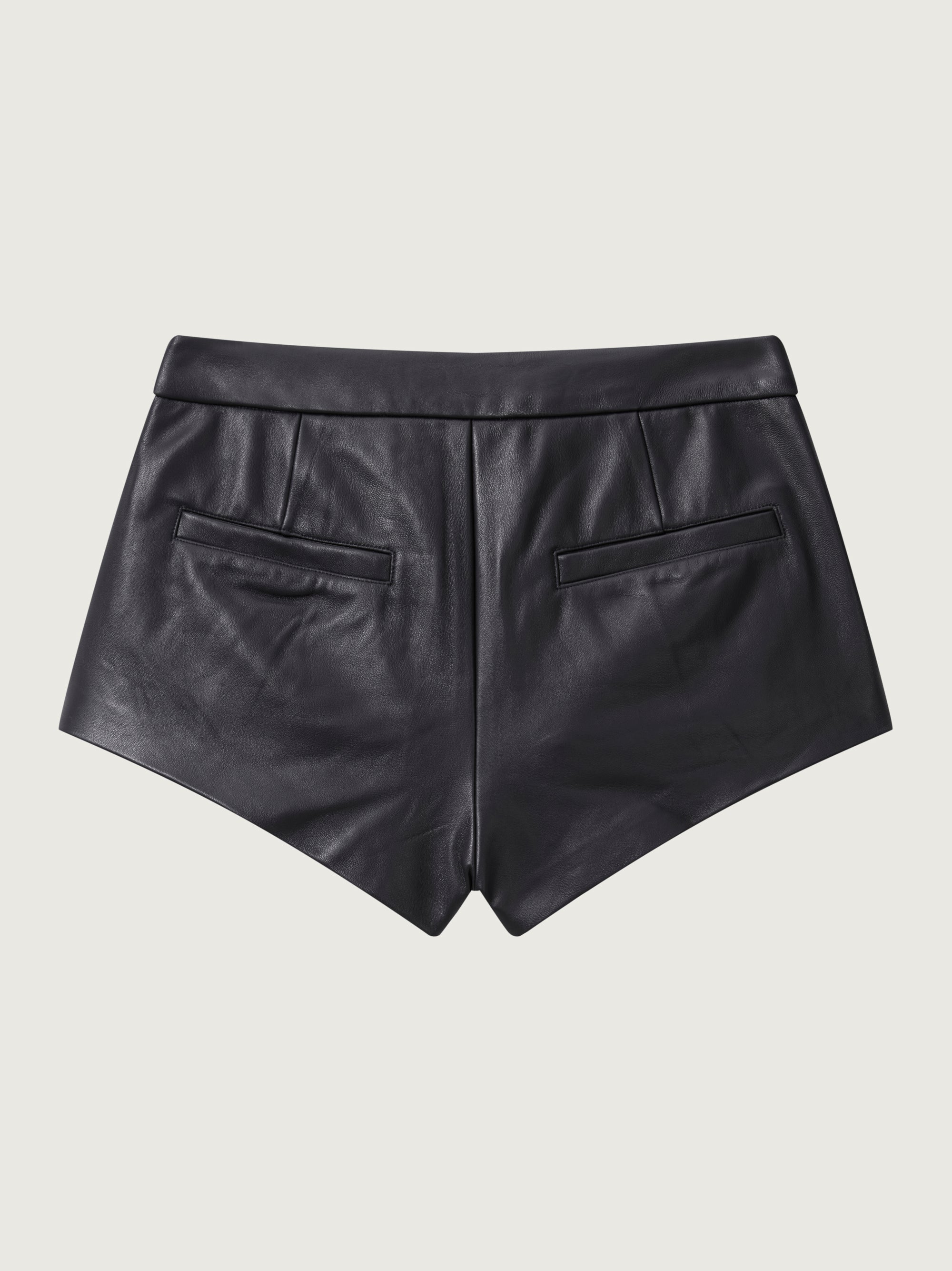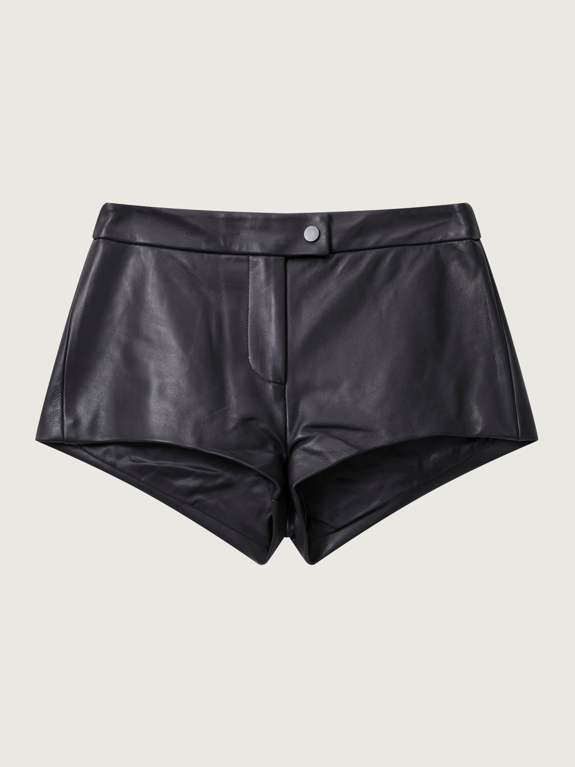 The Luka Shorts is cut from smooth leather into a sharp mini silhouette. Designed with a clean waistband and discreet closures, it sits mid-rise and close to the body, offering a streamlined foundation piece with edge.