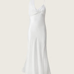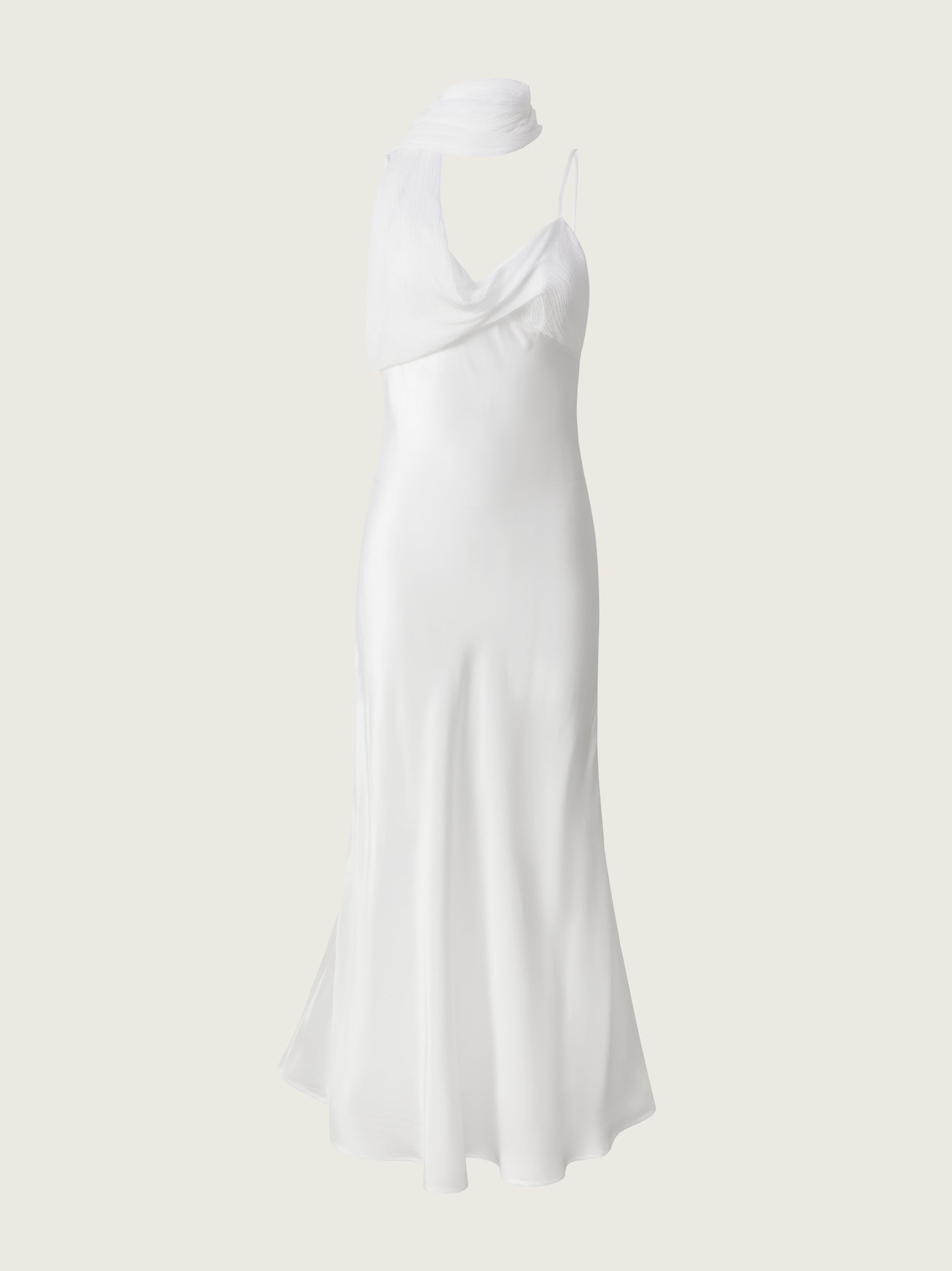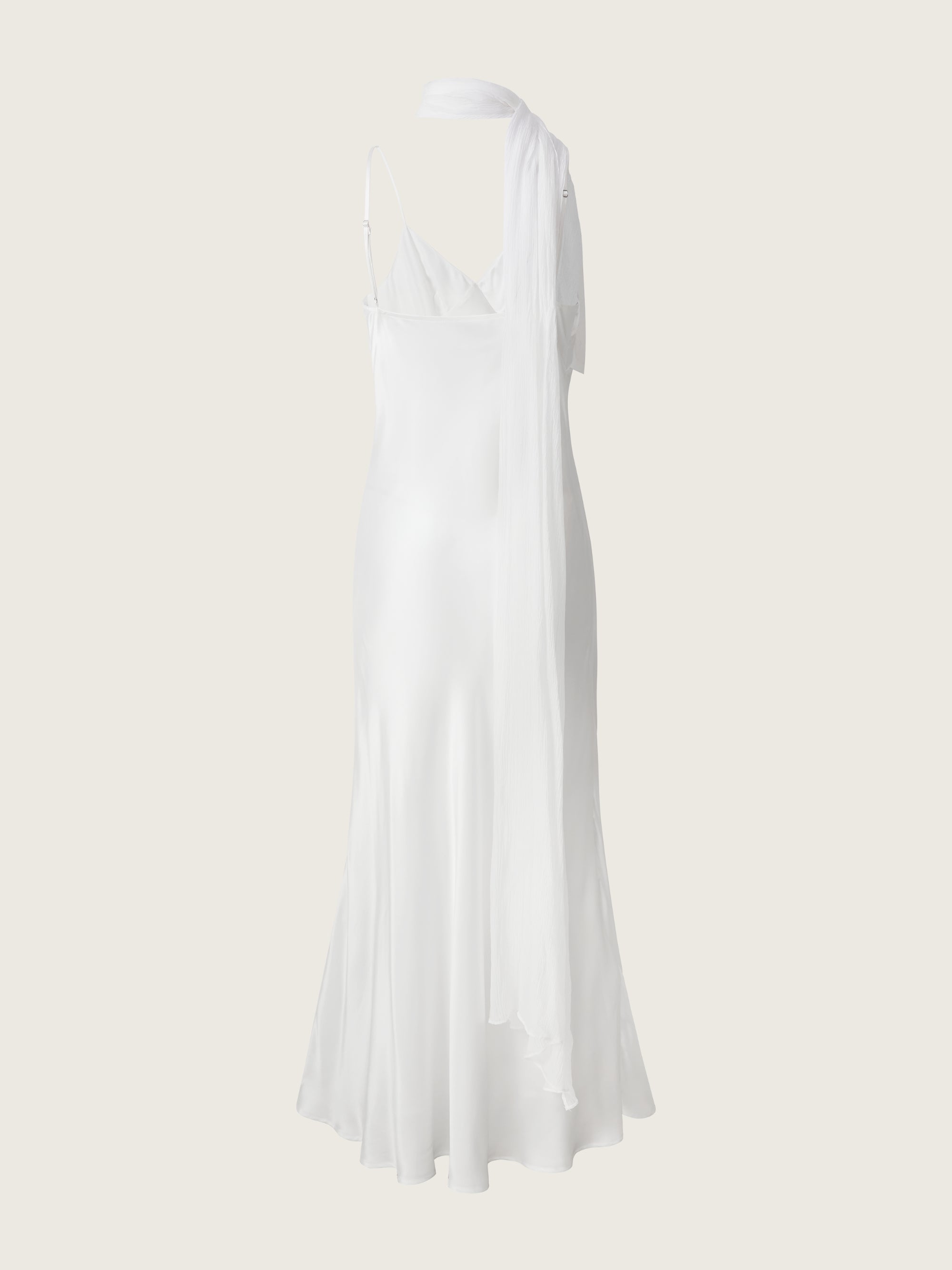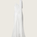 The Xenia Silk Scarf Gown is cut on the bias from smooth silk satin for a clean, elongated line. A fluid scarf panel is integrated into the neckline, designed to wrap or trail down the back for added drama. Finished with delicate straps and a sweeping hem, the silhouette speaks in softness and precision.